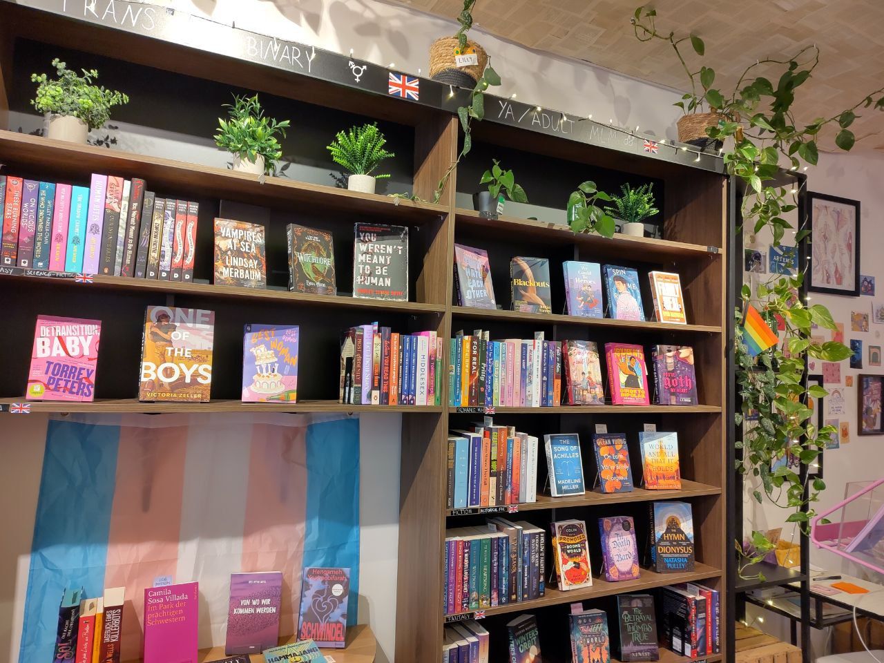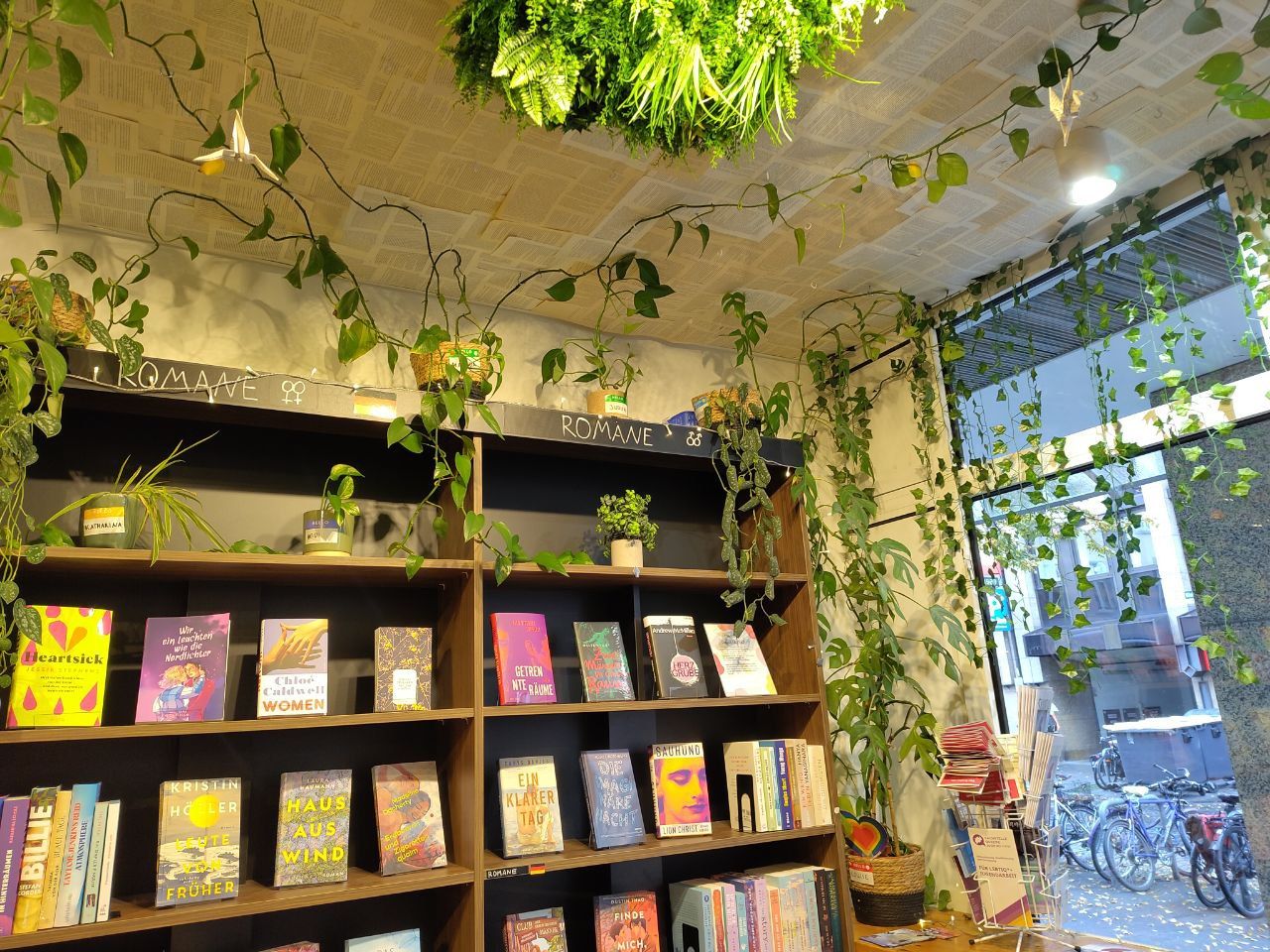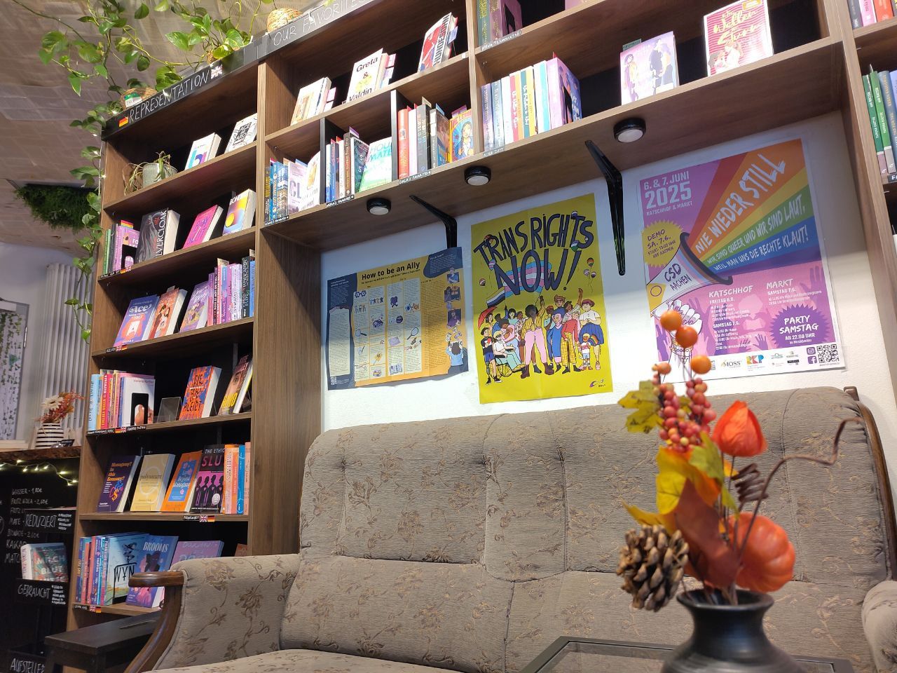 Wer das beim Kaffeetrinken angelesene Buch lieber gleich mit nach Hause nehmen möchte, kann in der Buchhandlung Artemis (siehe Fotos) stöbern, deren Sortiment überwiegend aus queeren Romanen und feministischen Sachbüchern in englischer Sprache besteht, die aber auch über ein gut kuratiertes deutschsprachiges Sortiment verfügt. Die liebevoll gestaltete kleine Buchhandlung erinnert selbst an das Setting eines „cozy“ Romans – auf Sitzgelegenheiten kann ausgiebig gestöbert werden, und Heißgetränke gibt es hier übrigens auch.