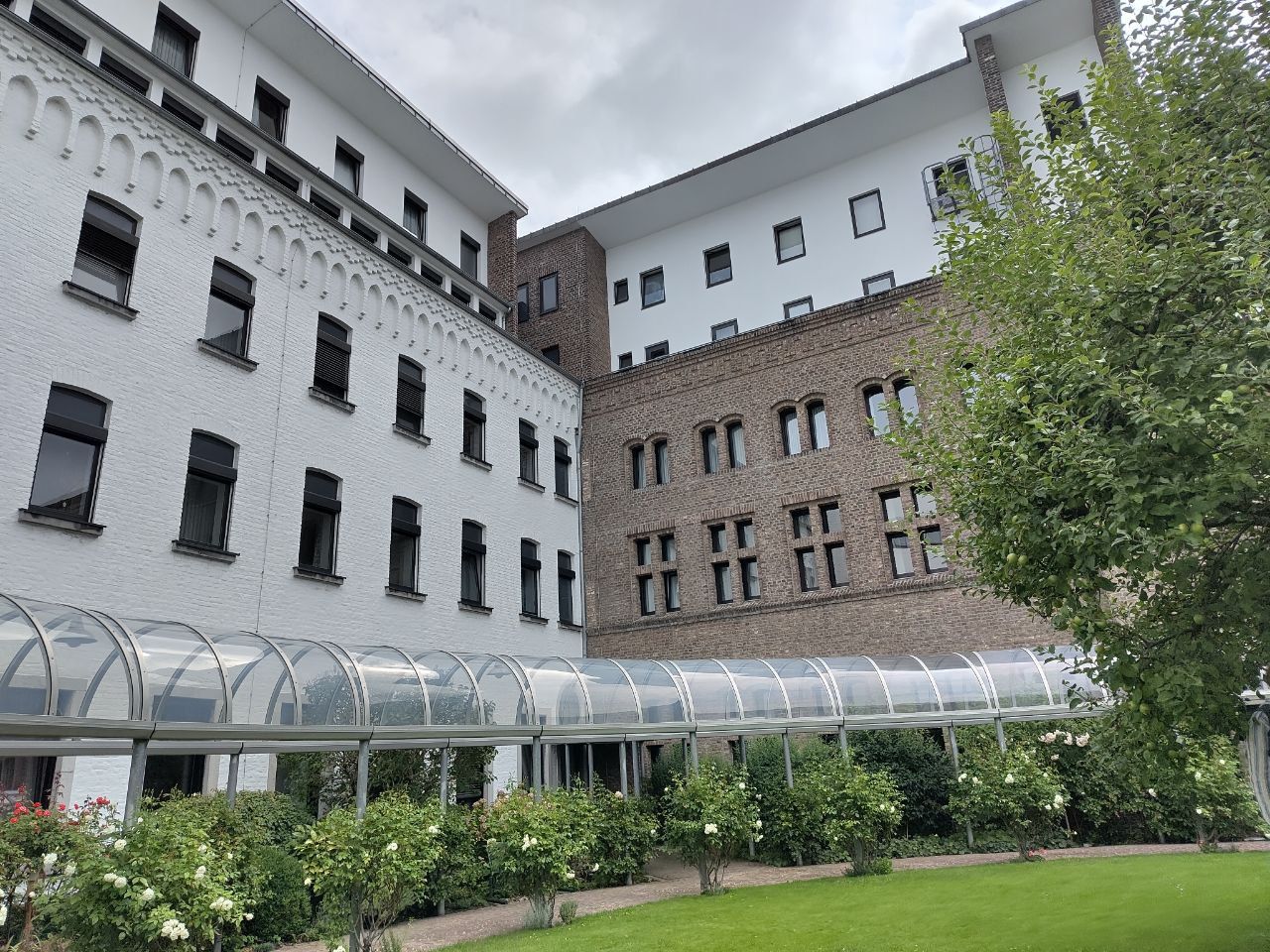 Das in der Einleitung angeteaserte versteckte Kleinod mitten in der Innenstadt verbirgt sich übrigens hinter Klostermauern: Schräg gegenüber der Elisabethhalle befindet sich das Kloster der Armen-Schwestern vom heiligen Franziskus, die auch nach ihrer Ordensgründerin Schervier-Schwestern genannt werden. Das Tätigkeitsfeld der Schwestern liegt in der sozial-caritativen Arbeit, so finden dort beispielsweise regelmäßige Mahlzeiten mit und für wohnungslose Menschen statt. Die kleine Kapelle des Klosters ist öffentlich, wer den Klostergarten mit herrlich ruhiger Sitzrunde um den Apfelbaum besuchen möchte, muss sich anmelden oder eine der Veranstaltungen besuchen, die die Schwestern anbieten – wie etwa Brotback-Seminare, Filmtage und Buchbindekurse.