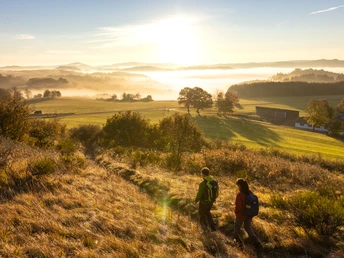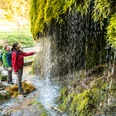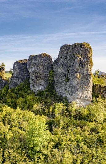 At the start of your hike in the crime novel capital of Hillesheim, you will already feel somewhat elevated because you are standing on the historical town walls of Hillesheim. From there, you have a wonderful view of the town and the Eifel landscape. A little later, you are greeted by the idyllic Bolsdorf valley with its lake, limestone cliffs and the Hillesheimer Bach, which winds through meadows. You hike on through the open landscape until you cross the Kyll river and then wind your way uphill step by step. A handrail in the sparse forest catches your eye - where does the flight of steps lead to? You are curious and climb the steps. A cold gust of air passes you by and it starts to get dark around you. You find yourself in one of the millstone caves near Roth. They were created by the excavation of millstones from inside the Rother Kopf volcano. In the forest outside the cave, you can even discover an unfinished millstone. Having reached the summit, a view down into the volcano opens up before you: you are looking into a lava mine. From Rother Kopf, you have a broad view of the hilly Eifel, perfect for a break before you go gently downhill again to the Gerolstein reservoir. You resist the temptation to turn off to the stage destination of Gerolstein here. Now it gets really exciting: after the volcanic landscape, the impressive cliffs of the Gerolstein Dolomites lie before you. This was once a sea (approx. 390 million years ago in the Lower Devonian)! Would you have thought that? The dolomites are a former coral reef. Allow you imagination to run wild and you will see it.