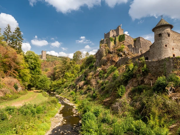 Today, your hike starts out gently along the first few metres through the Kurpark in Daun. But you soon realise that the landscape here must have had a fiery past. There is a particular atmosphere here, mystical and powerful. Step by step, you hike up to the first elevation and see something glittering between the trees. It is Gemündener Maar - a volcanic lake. You just know something dramatic must have happened here! Mighty explosions and fire from the earth’s interior blew holes in the earth and piled up mountains here in the Eifel. The holes are called “Maare” and some have filled up with water over time. How still and dark the water is, and fascinating too. You continue uphill to the summit of the crater’s edge and discover another Maar, Weinfelder Maar (also called Totenmaar). Up here, you will find the stone Dronketurm and can climb the steps to the viewing tower with ease. You allow your gaze to wander over the vibrant landscape of the volcanic Eifel. What an amazing feeling! But then you hear something: did anyone notice that? Yes! On the Weinfelder Maar meadows, goats are used as landscapers. Along a narrow path it’s downhill again to the Schalkenmehrener Maar, with the village of the same name on its banks. All three lakes together are also called Dauner Maare. After Schalkenmehren the hike leads you into the green valley of the Lieser. The picturesque little river ripples down to the valley. You share the valley with nature alone, listening to the birds singing and the gentle sound of the water. The long valley accompanies you to your stage destination in the castle town of Manderscheid. Just before Manderscheid, you follow the rocky path and catch a first glimpse of the Manderscheid Upper Castle.