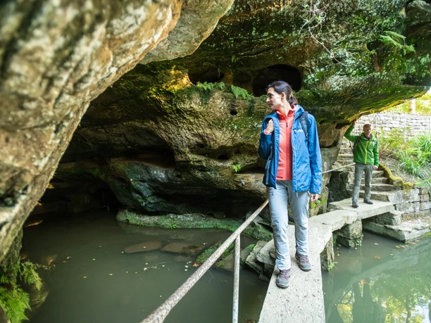 You leave the chapel and the view to heaven behind you. On the path winding around boulders and trees, you face northward. It is getting cooler. Mosses, lichens and ferns line the path. You descend via stairs, past mighty rock formations through a gorge flanked by two gigantic rock walls. It's as if you're passing through the gateway to the underworld. Suddenly a deep crevice opens up - breathtaking! Hold on tightly to your hands and carefully descend the stone steps. Now you understand why this place is called Devil's Gorge. It is simply devilishly beautiful here.