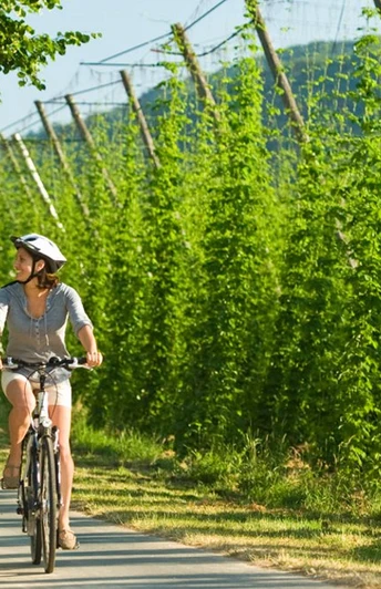 The Prüm Valley Cycle Route follows the second longest river in the Eifel from start to finish. The route does not always run evenly along the valley floor, favouring instead a variety of uphill and downhill paths. For this reason, we recommend that you tackle the route from the south. The route starts in Minden, where the Prüm flows into the Sauer. The path continues through the Lower Prüm Valley, past the majestic railway viaducts in Menningen and Irrel mill, until it reaches the climatic spa town of Irrel. The Siegfried Line Museum, the Irrel waterfalls, the Teufelsschlucht, or Devil’s Ravine, and the Nature Discovery Centre are all nearby and offer opportunities to take a breather. A few kilometres upstream at Holsthum, an incredible view awaits you. At harvest time, you can’t miss the rich green hops growing several metres high. Local hop grower Dick is happy to give you an insight into the secrets of this fine crop. At Biersdorf, quite a bit further down the road, the Bitburger Stausee reservoir offers you the chance of a rest on the waterside promenade. Next, visit Hamm Castle, the biggest of the Eifel castles which is still inhabited, where you can explore the fortification that dates from the late Middle Ages. Cycling through Waxweiler, Lünebach (Eifel zoo) and Pronsfeld, you will eventually arrive in the monastery town of Prüm, where the grave of Lothar I lies in the St Salvator basilica.