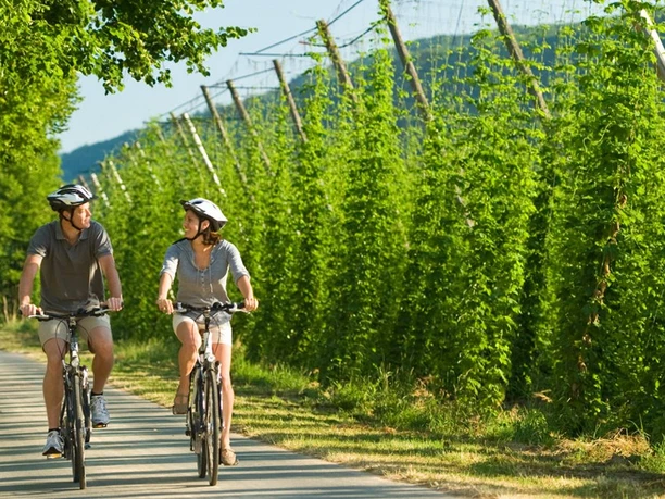 The PrĂ¼m Valley Cycle Route follows the second longest river in the Eifel from start to finish. The route does not always run evenly along the valley floor, favouring instead a variety of uphill and downhill paths. For this reason, we recommend that you tackle the route from the south. The route starts in Minden, where the PrĂ¼m flows into the Sauer. The path continues through the Lower PrĂ¼m Valley, past the majestic railway viaducts in Menningen and Irrel mill, until it reaches the climatic spa town of Irrel. The Siegfried Line Museum, the Irrel waterfalls, the Teufelsschlucht, or Devil’s Ravine, and the Nature Discovery Centre are all nearby and offer opportunities to take a breather. A few kilometres upstream at Holsthum, an incredible view awaits you. At harvest time, you can’t miss the rich green hops growing several metres high. Local hop grower Dick is happy to give you an insight into the secrets of this fine crop. At Biersdorf, quite a bit further down the road, the Bitburger Stausee reservoir offers you the chance of a rest on the waterside promenade. Next, visit Hamm Castle, the biggest of the Eifel castles which is still inhabited, where you can explore the fortification that dates from the late Middle Ages. Cycling through Waxweiler, LĂ¼nebach (Eifel zoo) and Pronsfeld, you will eventually arrive in the monastery town of PrĂ¼m, where the grave of Lothar I lies in the St Salvator basilica.